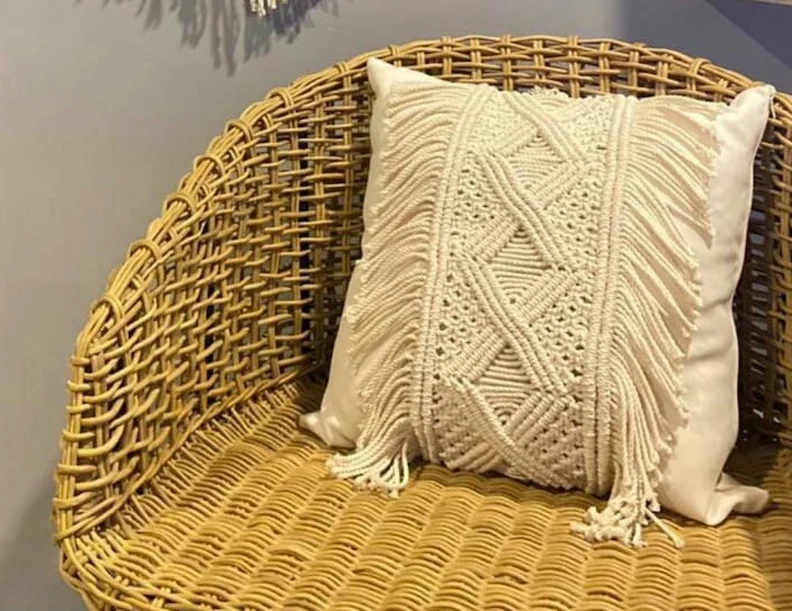 Cojín básico Relleno 100% Siliconado, antialérgico y anti ácaros con funda de tejido en macramé Lola Gold. (Incluye cojín de relleno).